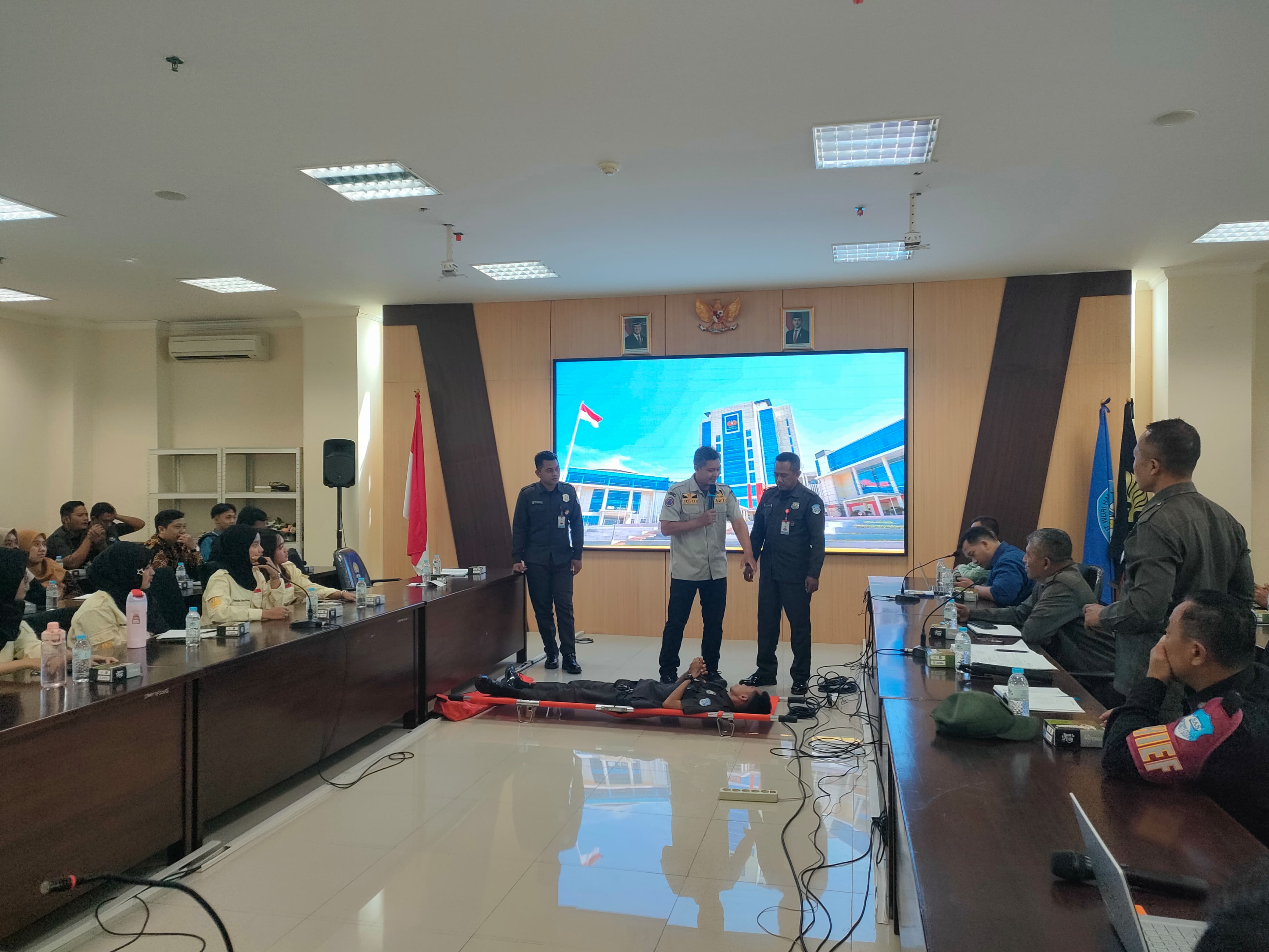 Simulasi pertolongan darurat menggunakan tandu sebagai bagian dari penerapan Keselamatan dan Kesehatan Kerja (K3)